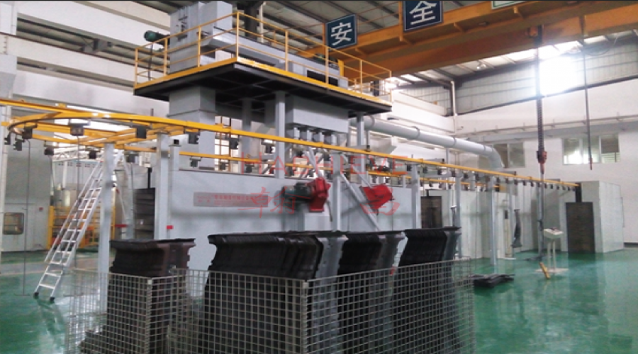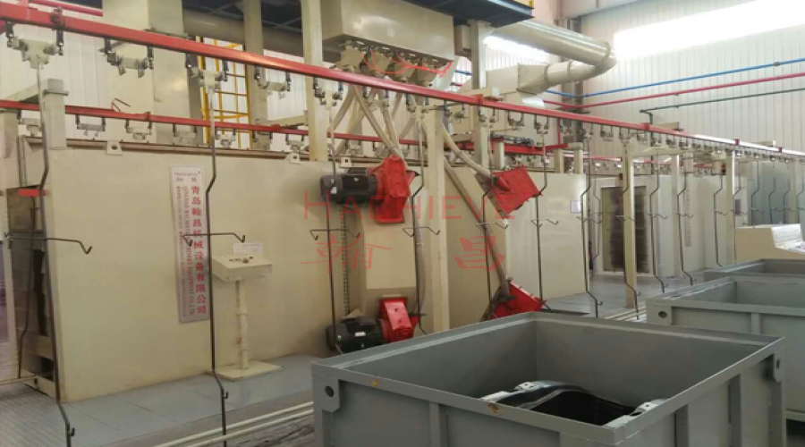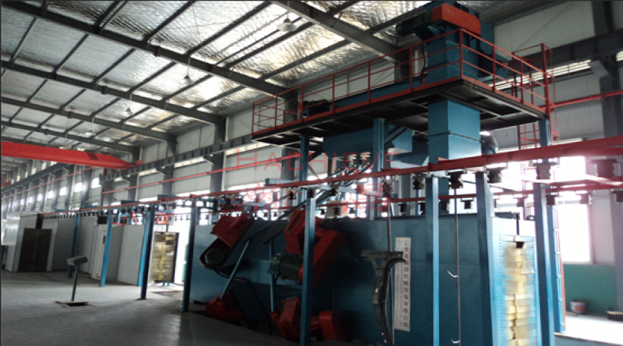 我公司为东莞中泰模具设计生产的抛丸涂油线包括一套自动悬挂式抛丸清理设备,一套自动涂油流平设备及相关电气控制系统。生产线前道工序通过抛丸处理能使热冲压件有效地达到除去氧化皮、强化、消除应力的作用,后道工序对热冲压件喷涂防锈油和流平,年处理量可达150-180万件,同时适用于汽车中门防撞杆、保险杠加强梁、门框加强梁等部件通过表面抛丸强化预处理。